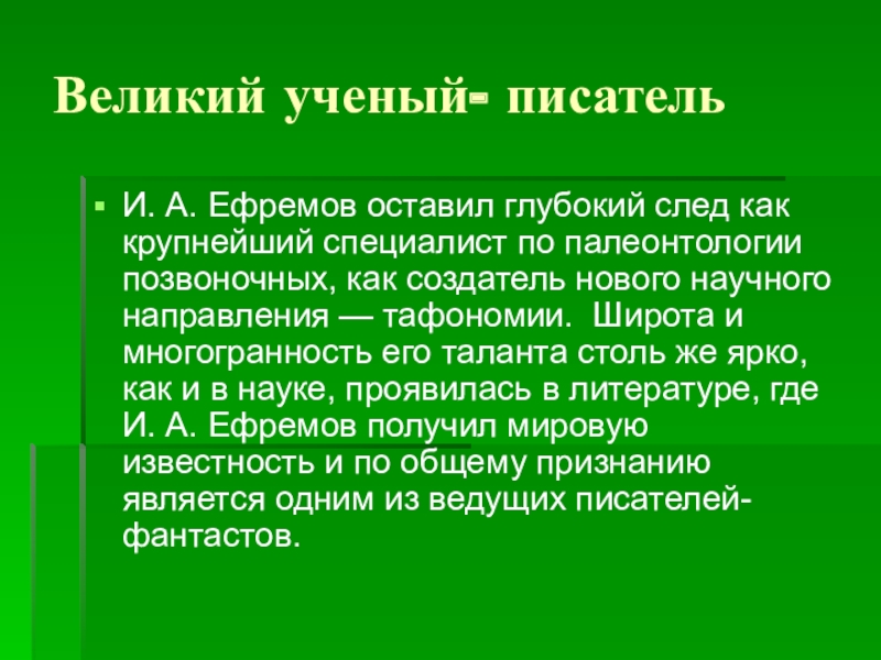 специалист по палеонтологии позвоночных, как создатель нового научного направления — тафономии. Широта и многогранность его таланта столь же ярко, как и в науке, проявилась в литературе, где И. А. Ефремов получил мировую известность и по общему признанию является одним из ведущих писателей-фантастов.