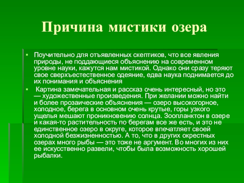 Картина замечательная и рассказ очень интересный, но это — художественные произведения. При желании можно найти и более прозаические объяснения — озеро высокогорное, холодное, берега в основном очень крутые, горы узкого ущелья мешают проникновению солнца. Зоопланктон в озере и какая-то растительность по берегам все же есть, и это не единственное озеро в округе, которое впечатляет своей холодной безжизненностью. А то, что в других окрестных озерах много рыбы — это тоже не аргумент. Во многих из них ее искусственно развели, чтобы была возможность хорошей рыбалки.