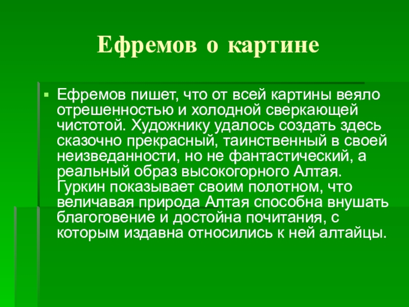холодной сверкающей чистотой. Художнику удалось создать здесь сказочно прекрасный, таинственный в своей неизведанности, но не фантастический, а реальный образ высокогорного Алтая. Гуркин показывает своим полотном, что величавая природа Алтая способна внушать благоговение и достойна почитания, с которым издавна относились к ней алтайцы.