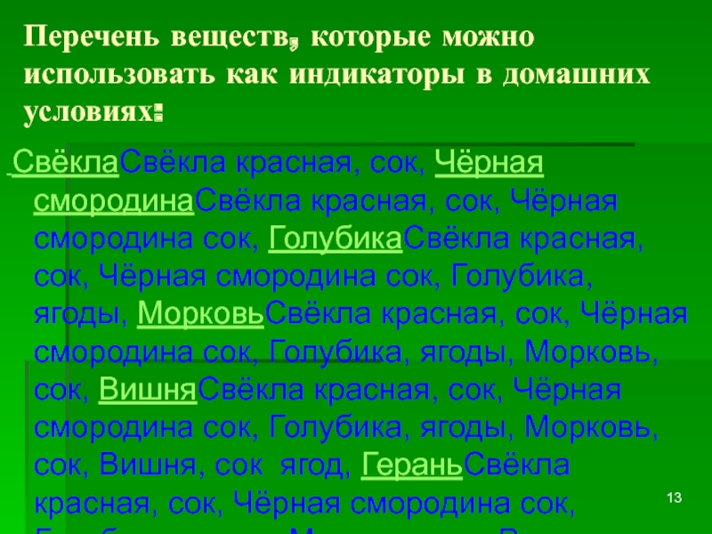 Слайд 13Перечень веществ, которые можно использовать как индикаторы в домашних условиях: