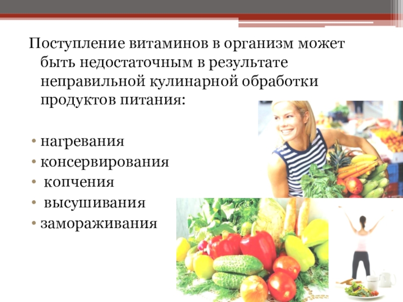 Слайд 9Поступление витаминов в организм может быть недостаточным в результате неправильной кулинарной