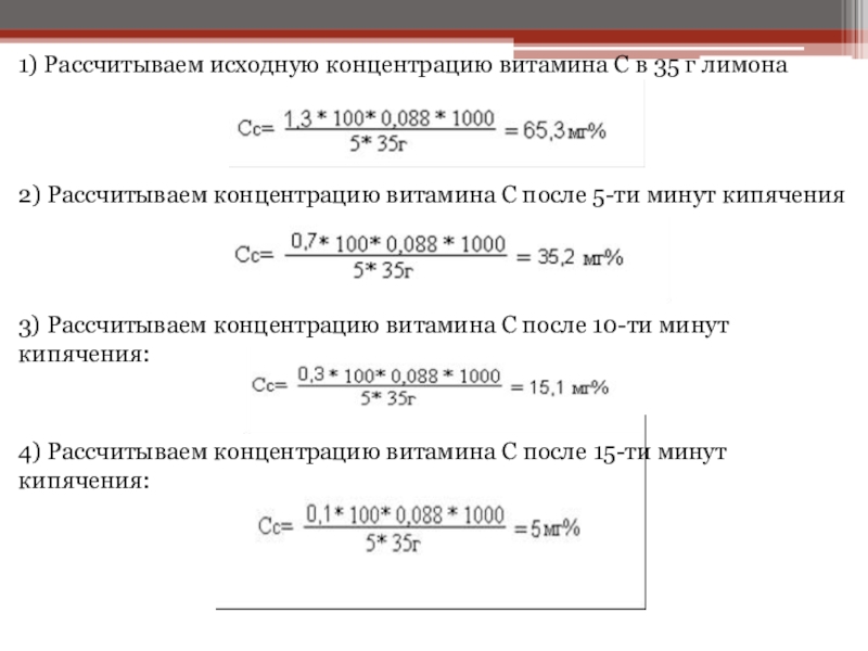Слайд 271) Рассчитываем исходную концентрацию витамина С в 35 г лимона