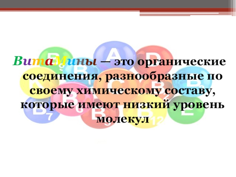 Слайд 5Витамины — это органические соединения, разнообразные по своему химическому составу, которые имеют низкий уровень
