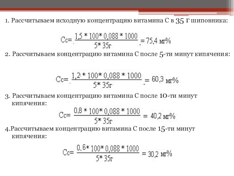 Слайд 261. Рассчитываем исходную концентрацию витамина С в 35 г шиповника: