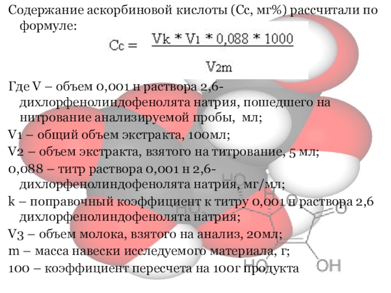 Слайд 25Содержание аскорбиновой кислоты (Сс, мг%) рассчитали по формуле: