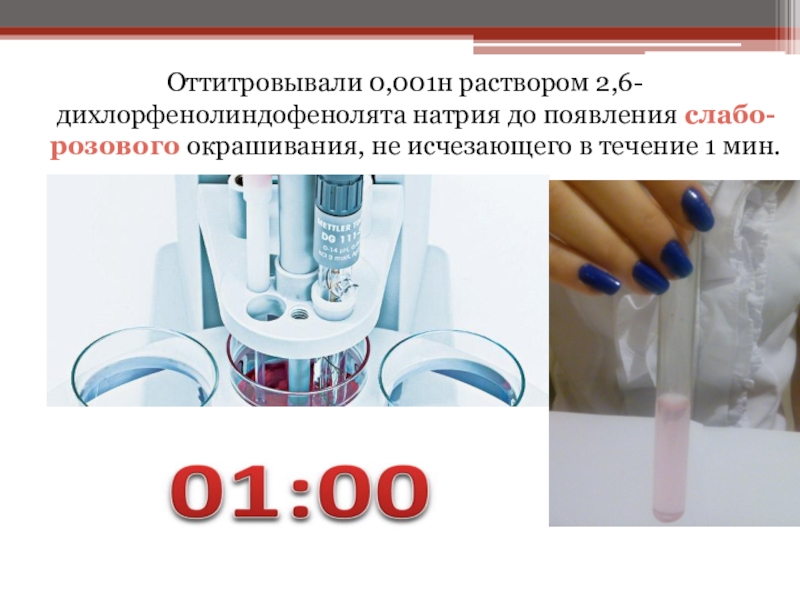 Слайд 24Оттитровывали 0,001н раствором 2,6-дихлорфенолиндофенолята натрия до появления слабо-розового окрашивания, не исчезающего
