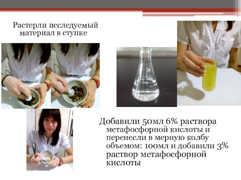 Слайд 20Добавили 50мл 6% раствора метафосфорной кислоты и перенесли в мерную колбу