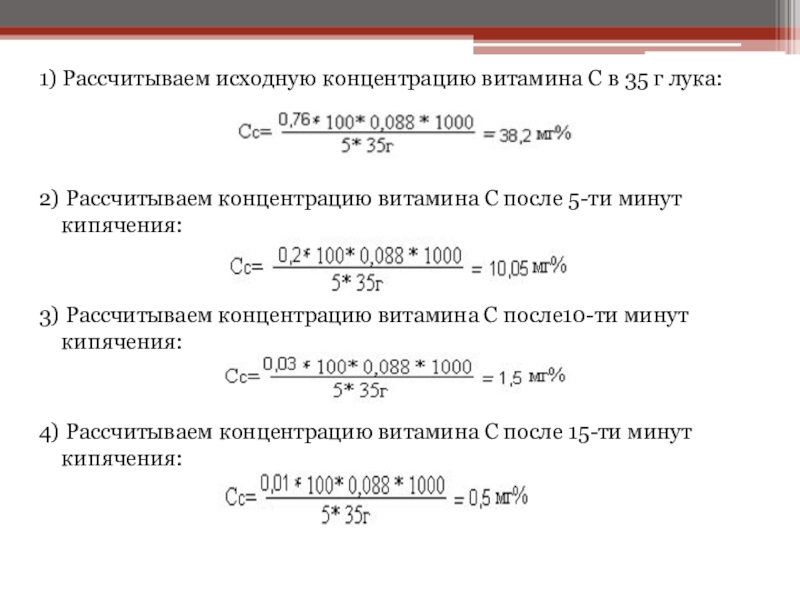 Слайд 281) Рассчитываем исходную концентрацию витамина С в 35 г лука: