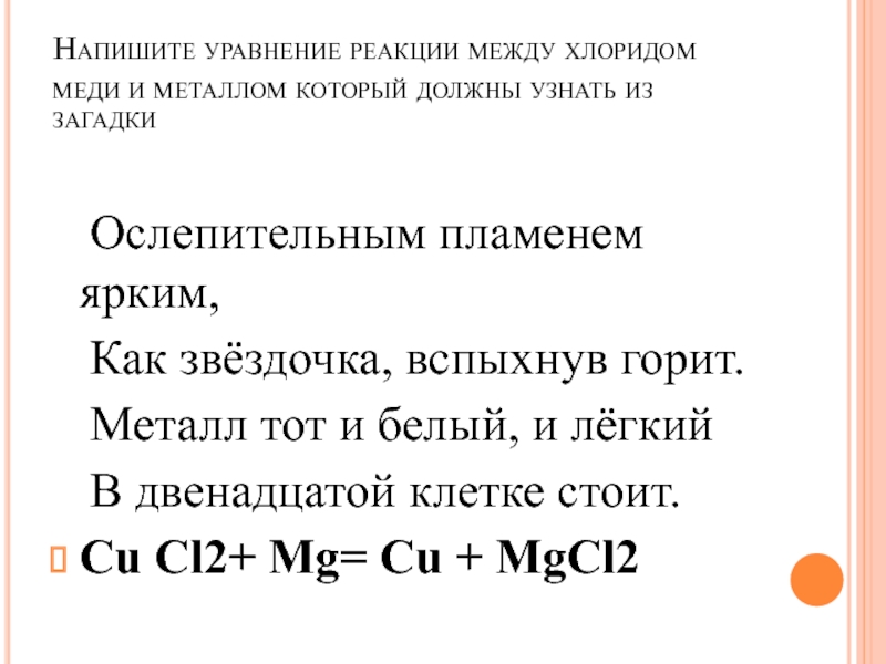 Сu Сl2+ Mg= Cu + MgCl2