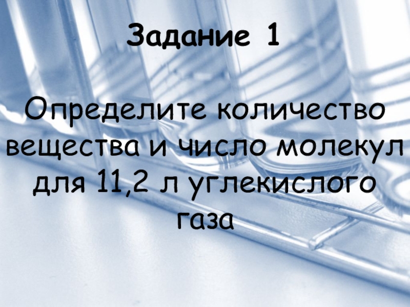 Слайд 4Задание 1 Определите количество вещества и число молекул для 11,2 л углекислого