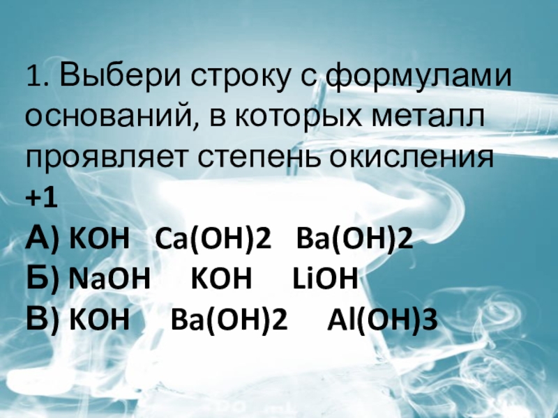 1. Выбери строку с формулами оснований, в которых металл проявляет степень окисления +1 А) KOH  Ca(OH)2