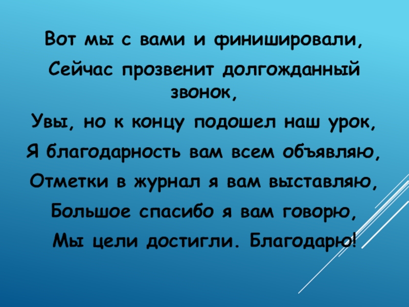 Вот мы с вами и финишировали,Сейчас прозвенит долгожданный звонок,Увы, но к концу подошел наш урок,Я благодарность вам