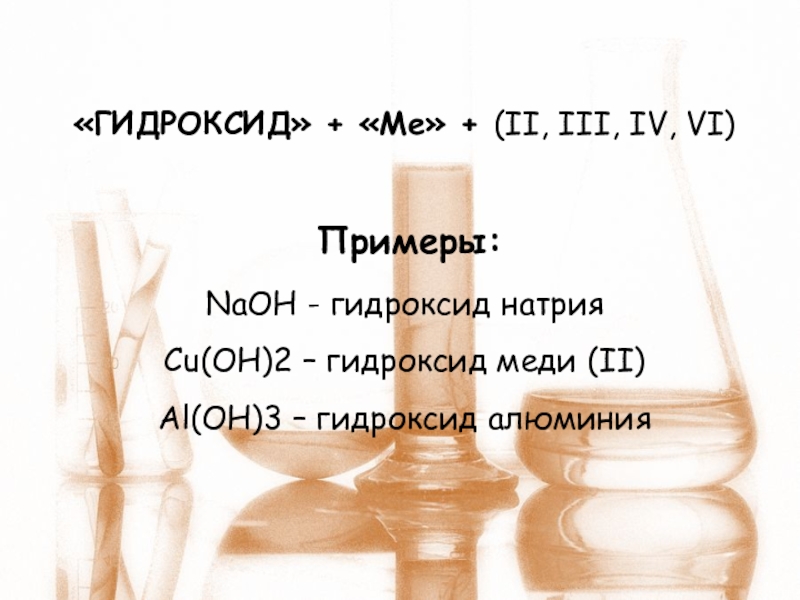 «ГИДРОКСИД» + «Ме» + (II, III, IV, VI)   Примеры: NaOH - гидроксид натрия