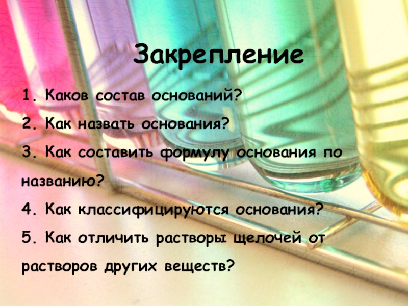 Закрепление 1. Каков состав оснований? 2. Как назвать основания? 3. Как составить формулу основания по названию? 4. Как классифицируются основания? 5. Как отличить растворы щелочей от растворов других веществ?