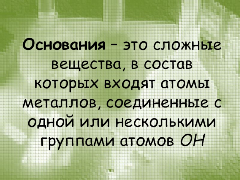 Основания – это сложные вещества, в состав которых входят атомы металлов, соединенные с одной или несколькими группами