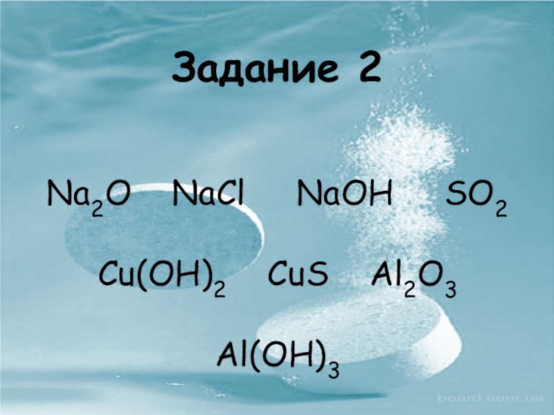 Задание 2   Na2O  NaCl   NaOH   SO2    Cu(OH)2