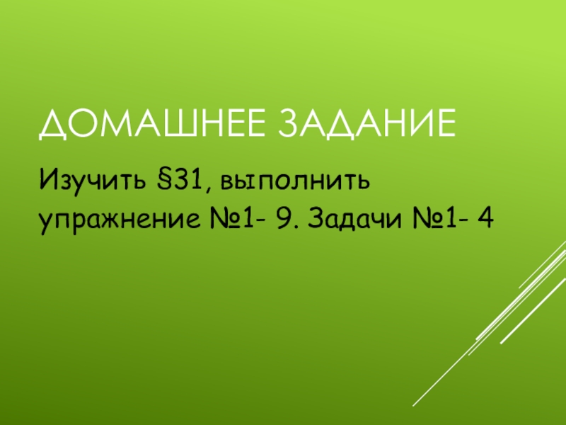 Домашнее заданиеИзучить §31, выполнить упражнение №1- 9. Задачи №1- 4