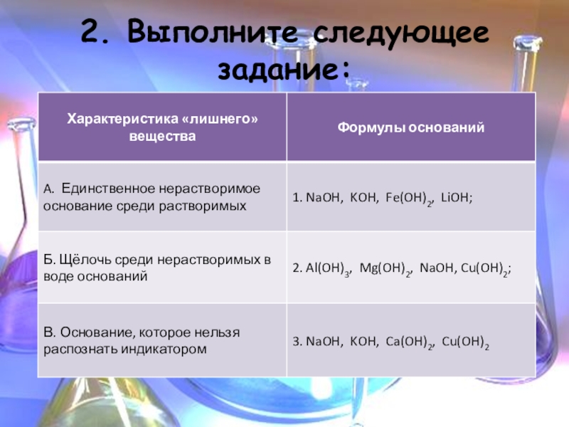 Слайд 141. Выбери строку с формулами оснований, в которых металл проявляет степень