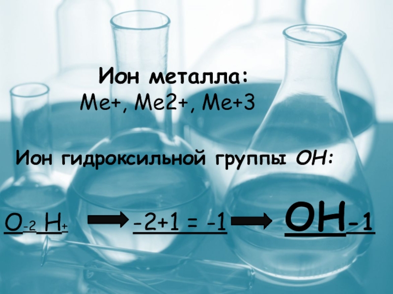 Ме2+, Ме+3 Ион гидроксильной группы ОН: О-2 Н+ -2+1 = -1 ОН-1
