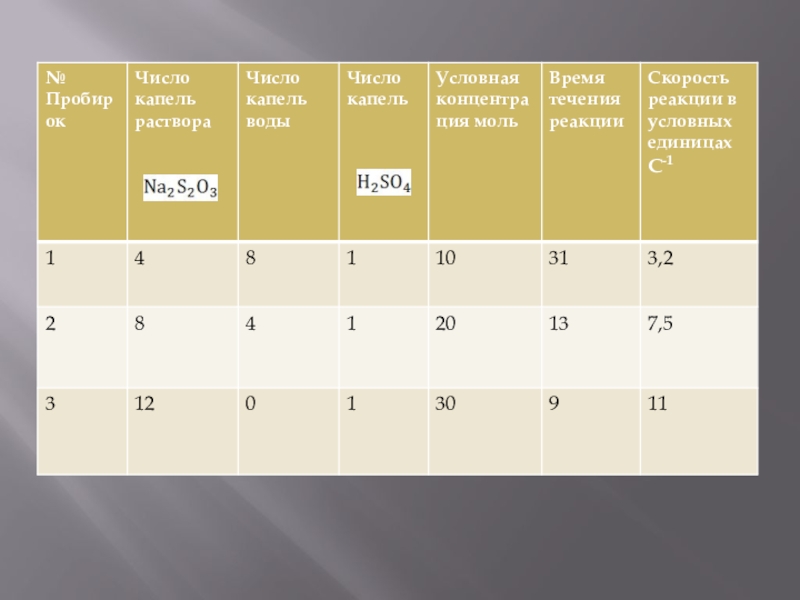 В пробирку 1 добавить одну каплю 2н. Раствора серной кислоты; раствор перемешать, чтобы реакция протекала во всем объеме раствора. По секундомеру или ручным часам измерить время от момента добавления кислоты до появления в растворе первоначального помутнения. Аналогичный опыт проделать во втором и третьем случае. Данные потом занести в таблицу.