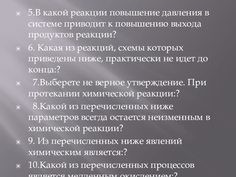 Слайд 205.В какой реакции повышение давления в системе приводит к повышению выхода