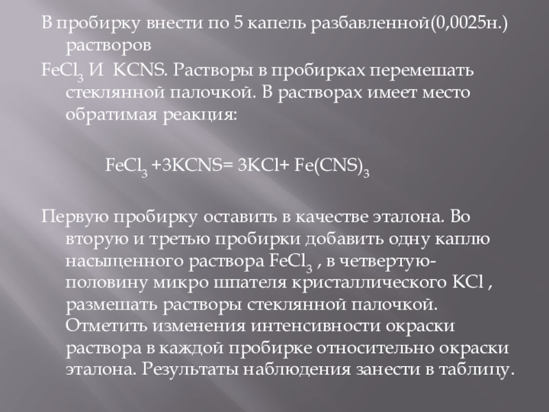 В пробирку внести по 5 капель разбавленной(0,0025н.) растворов FeCl3 И KCNS. Растворы в пробирках перемешать стеклянной палочкой.