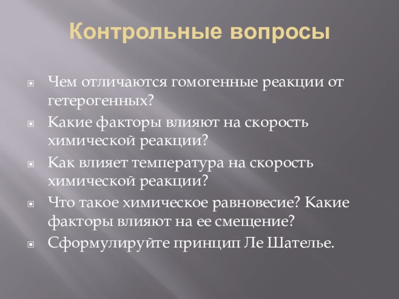 Контрольные вопросыЧем отличаются гомогенные реакции от гетерогенных?Какие факторы влияют на скорость химической реакции?Как влияет температура на скорость
