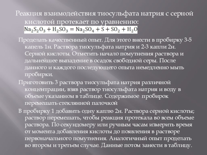 Реакция взаимодействия тиосульфата натрия с серной кислотой протекает по уравнению: Проделать качественный опыт. Для этого внести в