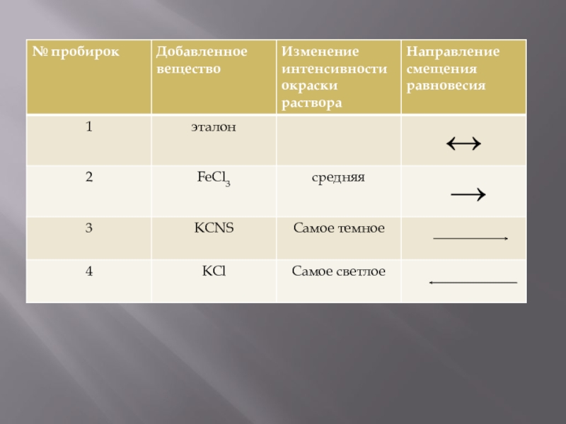 Первую пробирку оставить в качестве эталона. Во вторую и третью пробирки добавить одну каплю насыщенного раствора FeCl3 , в четвертую- половину микро шпателя кристаллического KCl , размешать растворы стеклянной палочкой. Отметить изменения интенсивности окраски раствора в каждой пробирке относительно окраски эталона. Результаты наблюдения занести в таблицу.