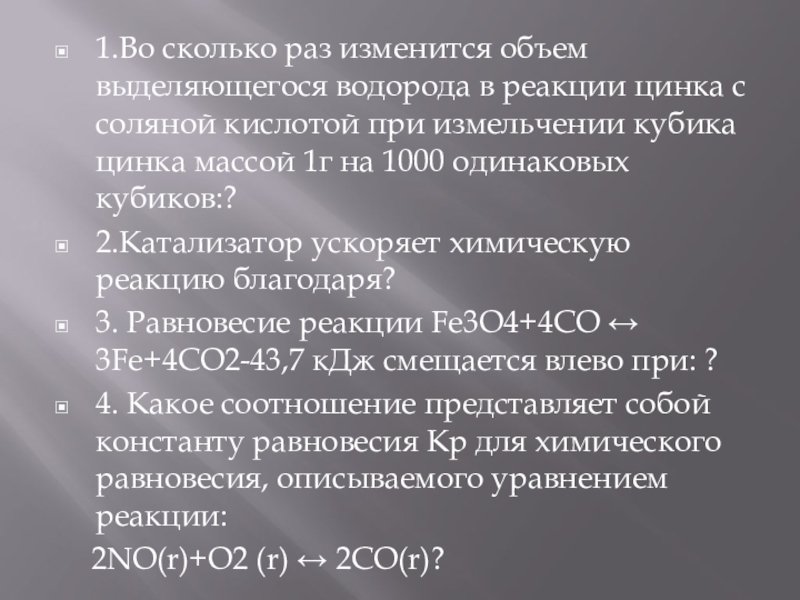 1.Во сколько раз изменится объем выделяющегося водорода в реакции цинка с соляной кислотой при измельчении кубика цинка