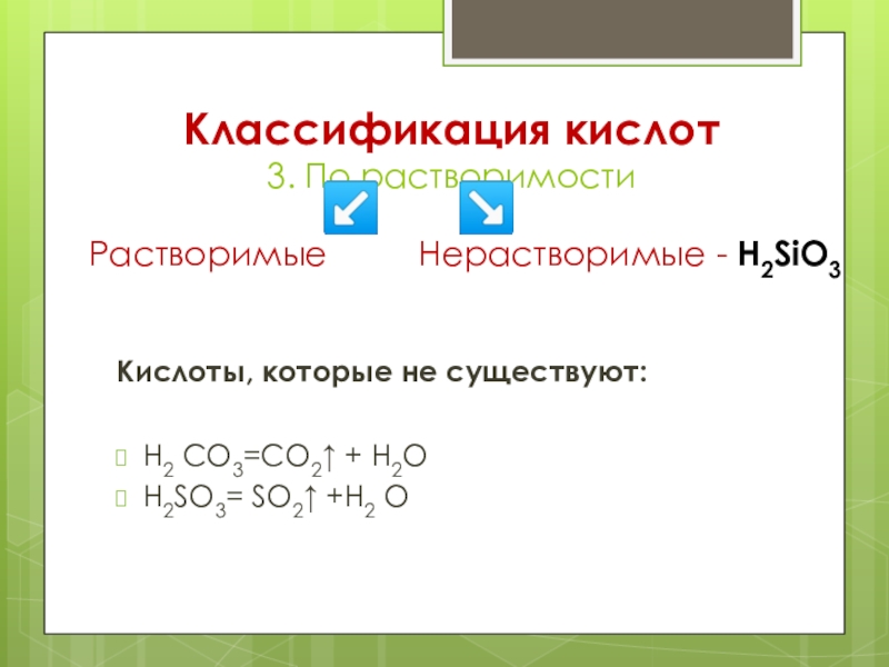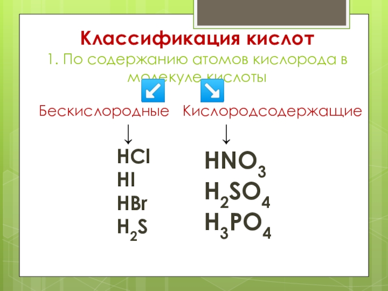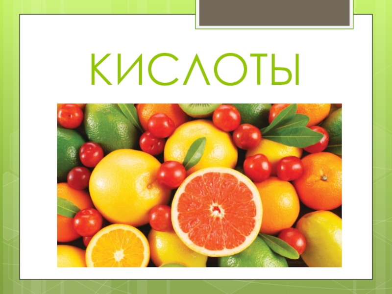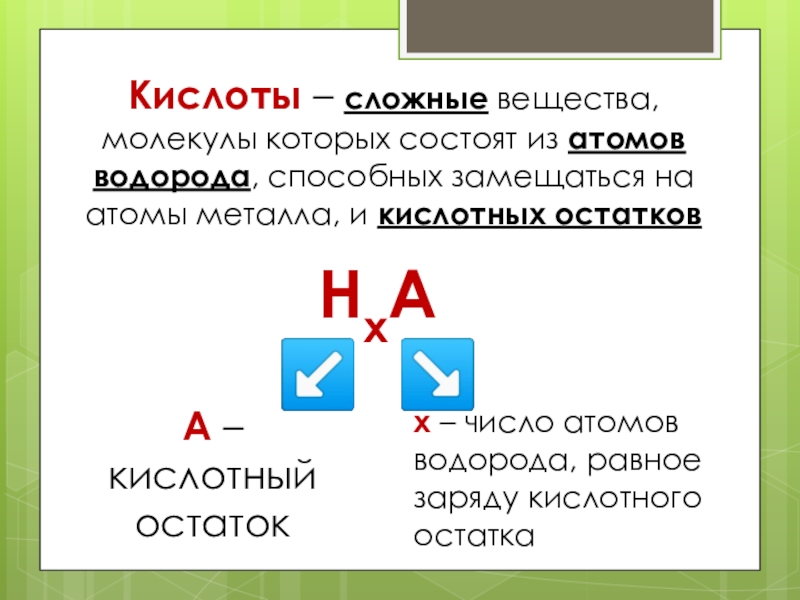 Кислоты – сложные вещества, молекулы которых состоят из атомов водорода, способных замещаться на атомы металла, и кислотных остатков