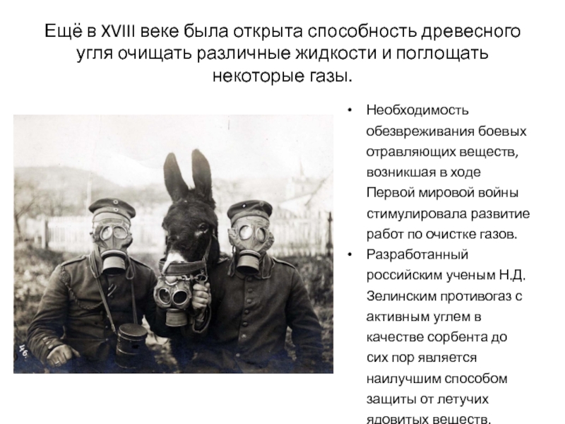 Необходимость обезвреживания боевых отравляющих веществ, возникшая в ходе Первой мировой войны стимулировала развитие работ по очистке газов.