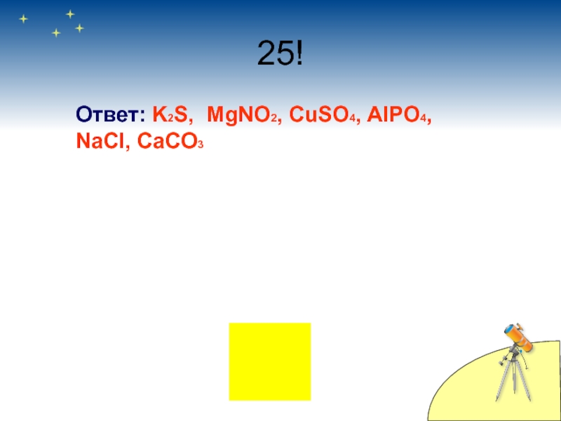 Ответ: K2S, MgNO2, CuSO4, AlPO4, NaCl, CaCO3