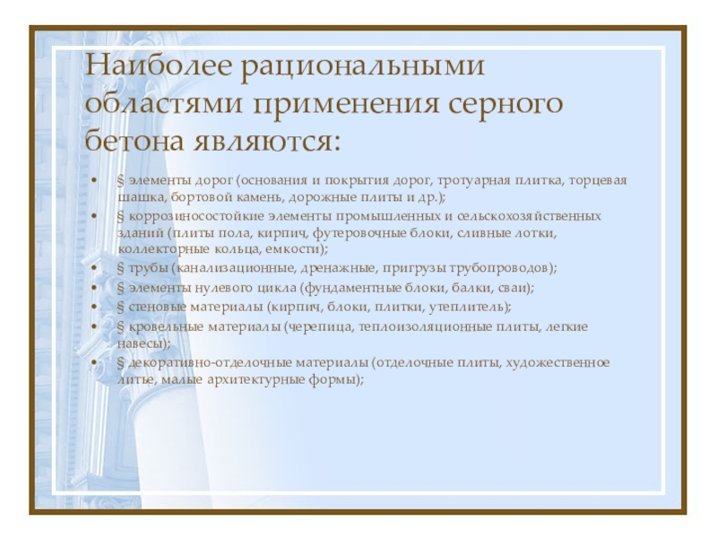 Слайд 11Наиболее рациональными областями применения серного бетона являются: