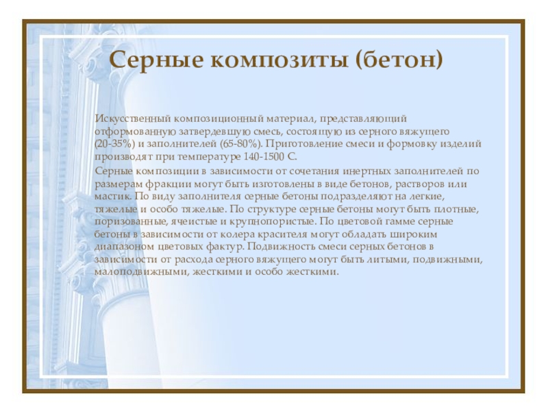 Серные композиции в зависимости от сочетания инертных заполнителей по размерам фракции могут быть изготовлены в виде бетонов, растворов или мастик. По виду заполнителя серные бетоны подразделяют на легкие, тяжелые и особо тяжелые. По структуре серные бетоны могут быть плотные, поризованные, ячеистые и крупнопористые. По цветовой гамме серные бетоны в зависимости от колера красителя могут обладать широким диапазоном цветовых фактур. Подвижность смеси серных бетонов в зависимости от расхода серного вяжущего могут быть литыми, подвижными, малоподвижными, жесткими и особо жесткими.