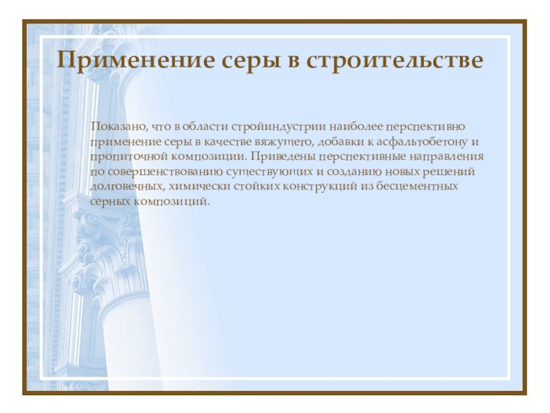 наиболее перспективно применение серы в качестве вяжущего, добавки к асфальтобетону и пропиточной композиции. Приведены перспективные направления по совершенствованию существующих и созданию новых решений долговечных, химически стойких конструкций из бесцементных серных композиций.