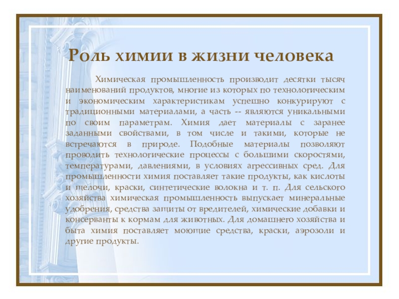 производит десятки тысяч наименований продуктов, многие из которых по технологическим и экономическим характеристикам успешно конкурируют с традиционными материалами, а часть -- являются уникальными по своим параметрам. Химия дает материалы с заранее заданными свойствами, в том числе и такими, которые не встречаются в природе. Подобные материалы позволяют проводить технологические процессы с большими скоростями, температурами, давлениями, в условиях агрессивных сред. Для промышленности химия поставляет такие продукты, как кислоты и щелочи, краски, синтетические волокна и т. п. Для сельского хозяйства химическая промышленность выпускает минеральные удобрения, средства защиты от вредителей, химические добавки и консерванты к кормам для животных. Для домашнего хозяйства и быта химия поставляет моющие средства, краски, аэрозоли и другие продукты.
