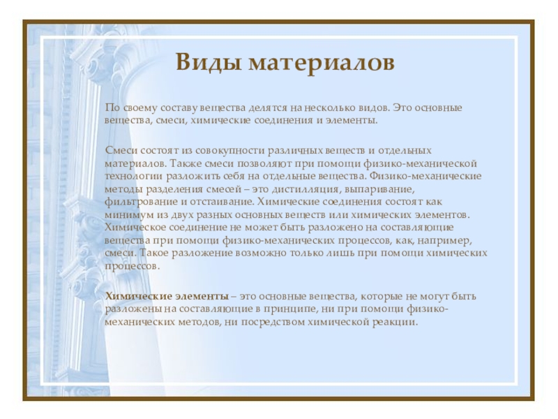 несколько видов. Это основные вещества, смеси, химические соединения и элементы.