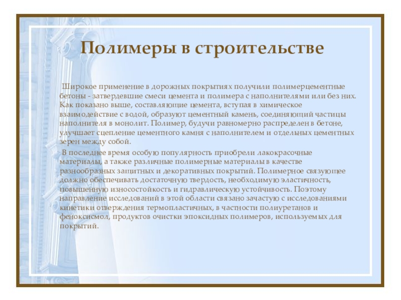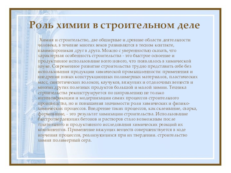 строительство, две обширные и древние области деятельности человека, в течение многих веков развиваются в тесном контакте, взаимопроникая друг в друга. Можно с уверенностью сказать, что характерная особенность строительства - это быстрое освоение и продуктивное использование всего нового, что появлялось в химической науке. Современное развитие строительства трудно представить себе без использования продукции химической промышленности: применения и внедрения новых конструкционных полимерных материалов, пластических масс, синтетических волокон, каучуков, вяжущих и отделочных веществ и многих других полезных продуктов большой и малой химии. Техника строительства реконструируется по направлению не только интенсификации и модернизации самих процессов строительного производства, но и повышения значимости роли химических и физико-химических процессов. Внедрение таких процессов, как склеивание, сварка, формование, - это результат химизации строительства. Использование быстротвердеющих бетонов и растворов стало возможным после тщательного и продуктивного исследования химических реакций их компонентов. Применение вяжущих веществ совершенствуется в ходе изучения процессов, реализующихся при их твердении. строительство химия полимерный сера.