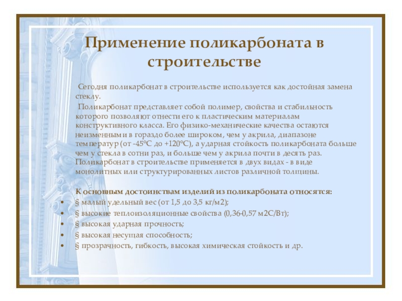 Поликарбонат представляет собой полимер, свойства и стабильность которого позволяют отнести его к пластическим материалам конструктивного класса. Его физико-механические качества остаются неизменными в гораздо более широком, чем у акрила, диапазоне температур (от -45°С до +120°С), а ударная стойкость поликарбоната больше чем у стекла в сотни раз, и больше чем у акрила почти в десять раз. Поликарбонат в строительстве применяется в двух видах - в виде монолитных или структурированных листов различной толщины.