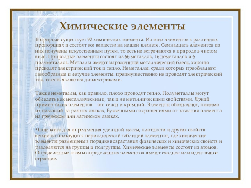 Из этих элементов в различных пропорциях и состоят все вещества на нашей планете. Семнадцать элементов из них получены искусственным путем, то есть не встречаются в природе в чистом виде. Природные элементы состоят из 66 металлов, 16 неметаллов и 6 полуметаллов. Металлы имеют выраженный металлический блеск, хорошо проводят электрический ток и тепло. Неметаллы, среди которых преобладают газообразные и летучие элементы, преимущественно не проводят электрический ток, то есть являются диэлектриками.