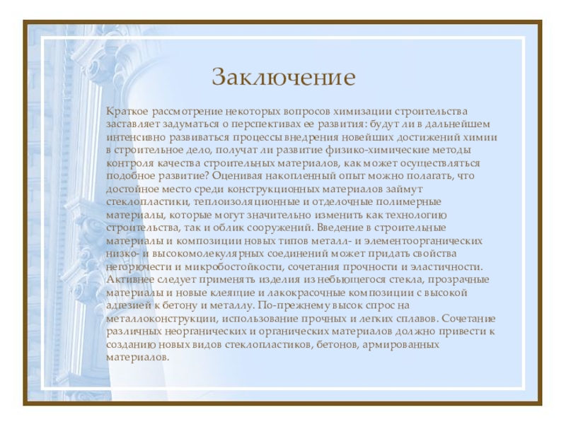 заставляет задуматься о перспективах ее развития: будут ли в дальнейшем интенсивно развиваться процессы внедрения новейших достижений химии в строительное дело, получат ли развитие физико-химические методы контроля качества строительных материалов, как может осуществляться подобное развитие? Оценивая накопленный опыт можно полагать, что достойное место среди конструкционных материалов займут стеклопластики, теплоизоляционные и отделочные полимерные материалы, которые могут значительно изменить как технологию строительства, так и облик сооружений. Введение в строительные материалы и композиции новых типов металл- и элементоорганических низко- и высокомолекулярных соединений может придать свойства негорючести и микробостойкости, сочетания прочности и эластичности. Активнее следует применять изделия из небьющегося стекла, прозрачные материалы и новые клеящие и лакокрасочные композиции с высокой адгезией к бетону и металлу. По-прежнему высок спрос на металлоконструкции, использование прочных и легких сплавов. Сочетание различных неорганических и органических материалов должно привести к созданию новых видов стеклопластиков, бетонов, армированных материалов.