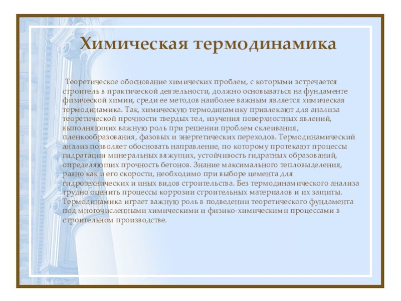 которыми встречается строитель в практической деятельности, должно основываться на фундаменте физической химии, среди ее методов наиболее важным является химическая термодинамика. Так, химическую термодинамику привлекают для анализа теоретической прочности твердых тел, изучения поверхностных явлений, выполняющих важную роль при решении проблем склеивания, пленкообразования, фазовых и энергетических переходов. Термодинамический анализ позволяет обосновать направление, по которому протекают процессы гидратации минеральных вяжущих, устойчивость гидратных образований, определяющих прочность бетонов. Знание максимального тепловыделения, равно как и его скорости, необходимо при выборе цемента для гидротехнических и иных видов строительства. Без термодинамического анализа трудно оценить процессы коррозии строительных материалов и их защиты. Термодинамика играет важную роль в подведении теоретического фундамента под многочисленными химическими и физико-химическими процессами в строительном производстве.