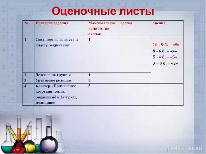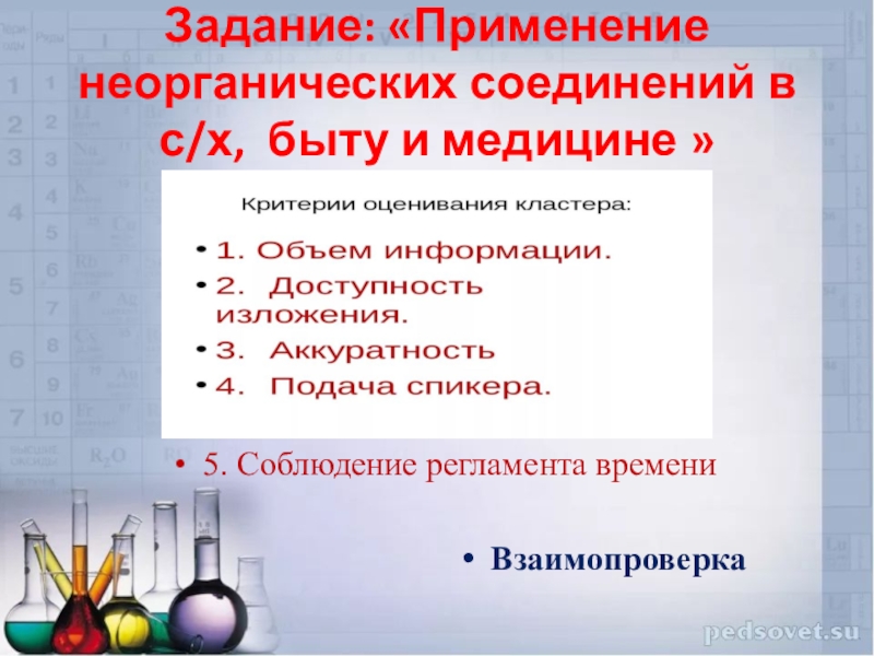 Задание: «Применение неорганических соединений в с/х, быту и медицине » 5. Соблюдение регламента времениВзаимопроверка