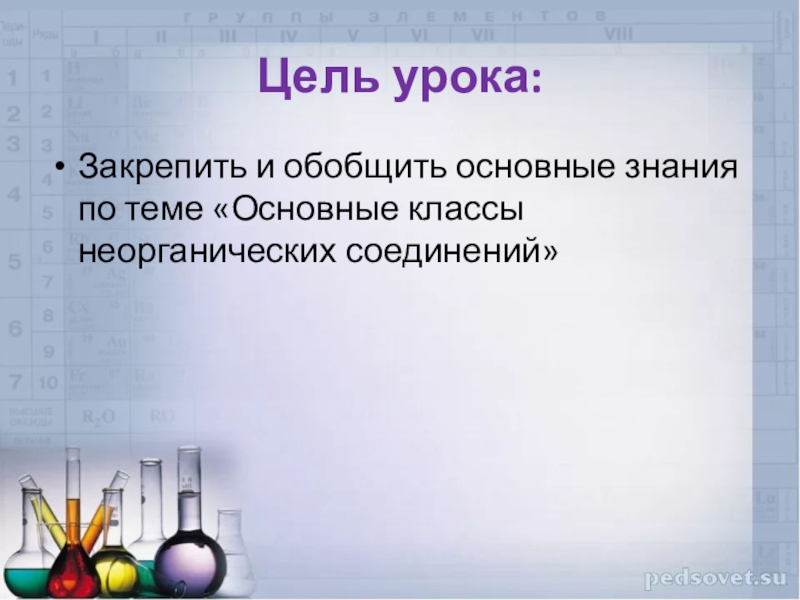 Цель урока:Закрепить и обобщить основные знания по теме «Основные классы неорганических соединений»