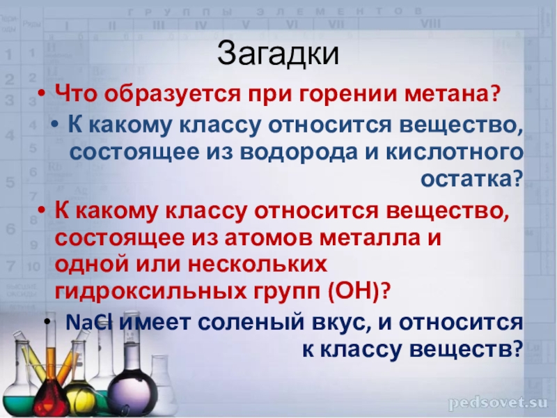 ЗагадкиЧто образуется при горении метана? К какому классу относится вещество, состоящее из водорода и кислотного остатка?К какому