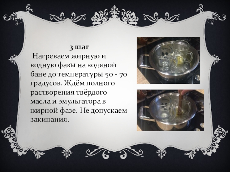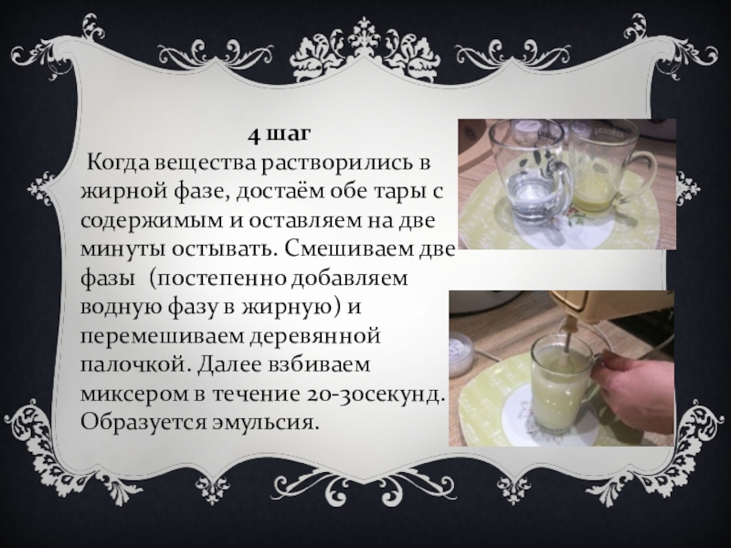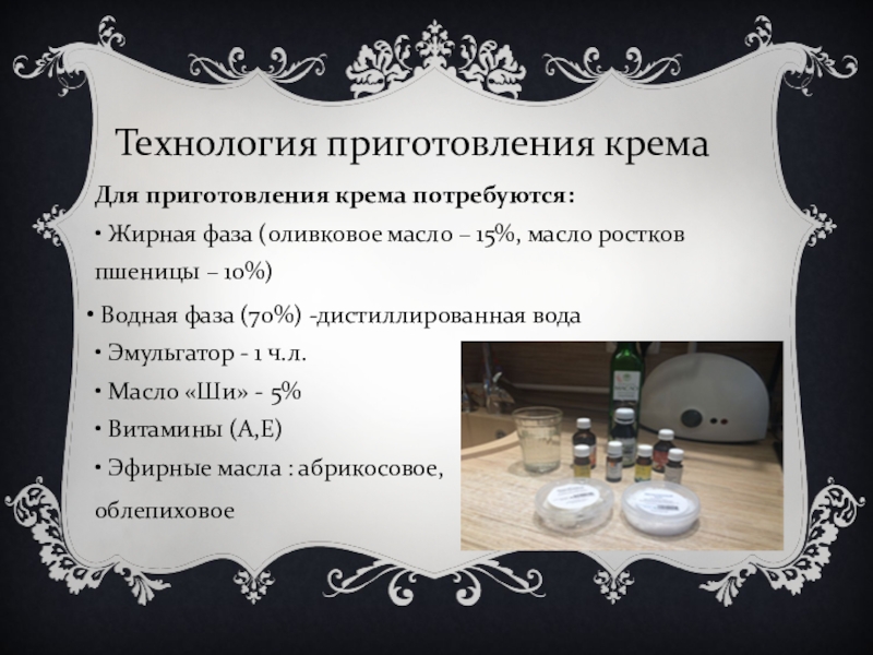 Добавляем в нашу основу масла (абрикосовое, облепиховое), эфирные масла (иланг – иланг, розмарин), витамины (А,Е). Перекладываем крем в подготовленную, обработанную емкость и ставим в холодильник.