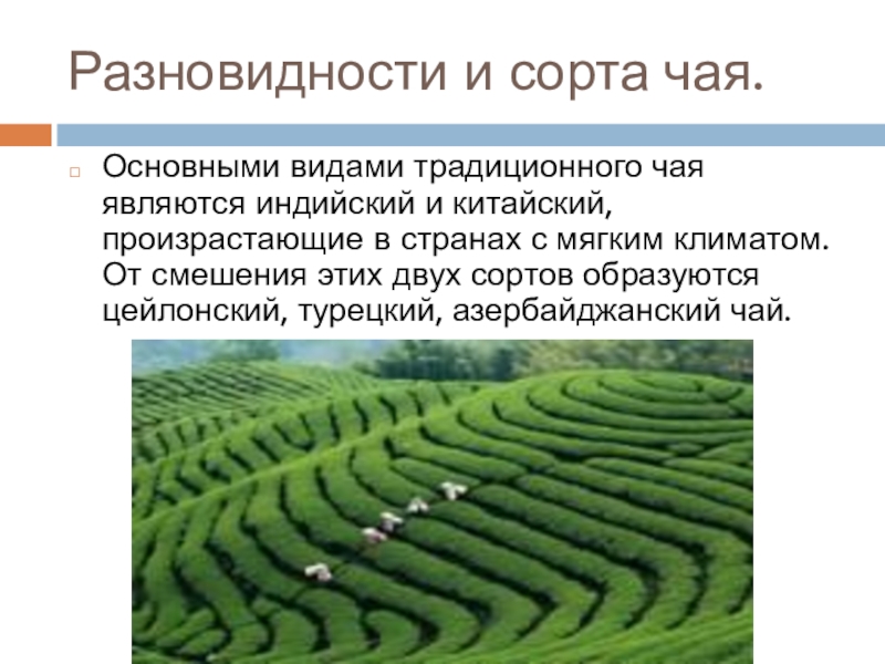 произрастающие в странах с мягким климатом. От смешения этих двух сортов образуются цейлонский, турецкий, азербайджанский чай.