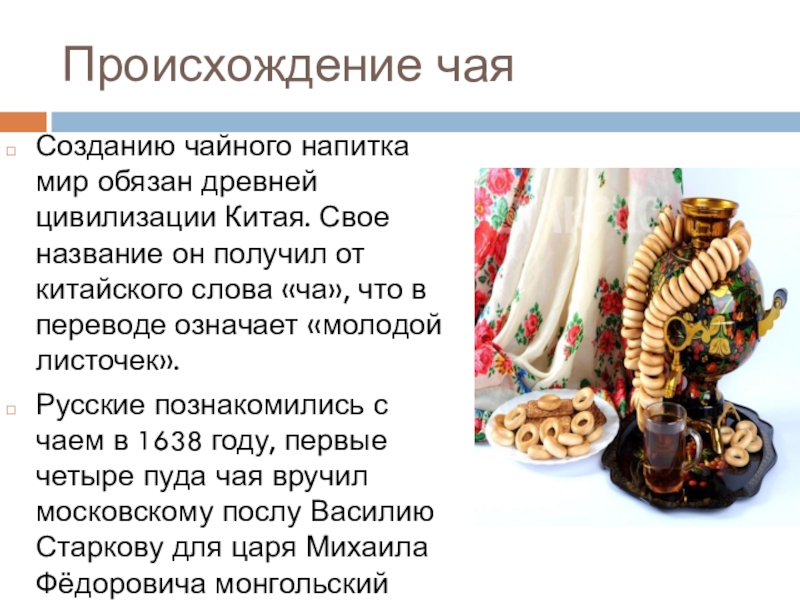 Русские познакомились с чаем в 1638 году, первые четыре пуда чая вручил московскому послу Василию Старкову для царя Михаила Фёдоровича монгольский Алтан-хан Кучкун.