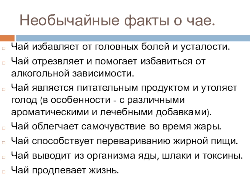 Чай является питательным продуктом и утоляет голод (в особенности - с различными ароматическими и лечебными добавками).